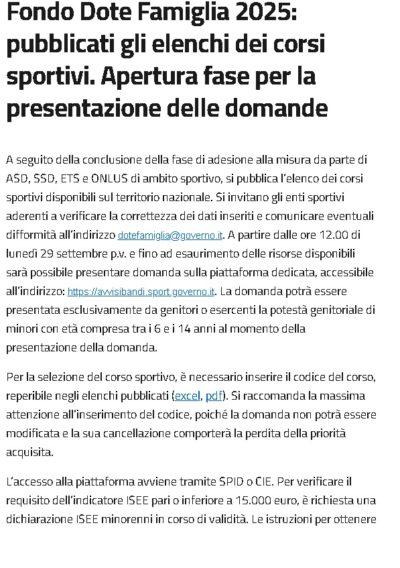 Fondo Dote Famiglia 2025: pubblicati gli elenchi dei corsi sportivi e apertura fase per la presentazione delle domande